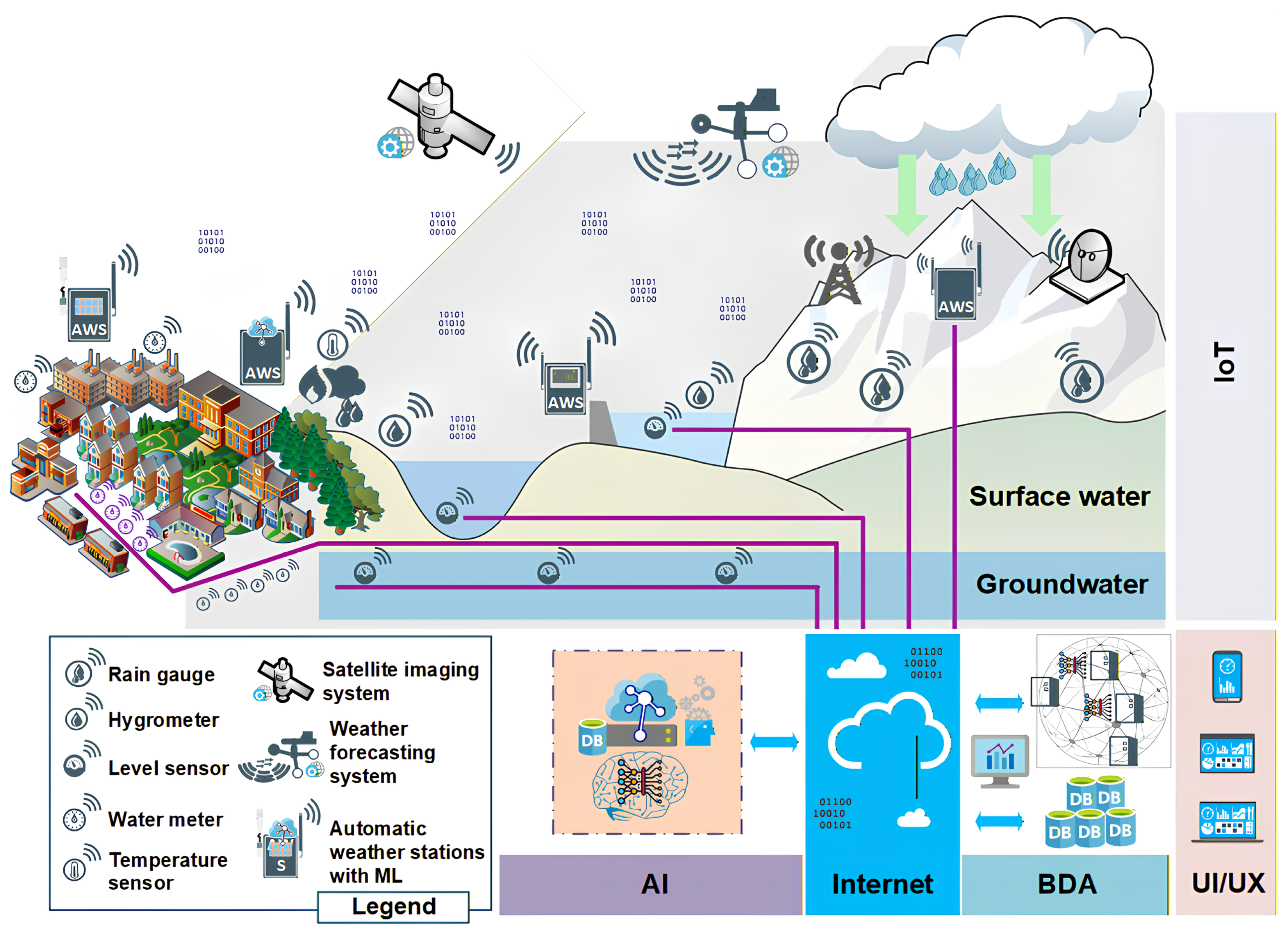 • An integrated overview of the IoT, EC, AI, and BDA technology chain, illustrating how sensing, edge analytics, learning, and data governance work together to underpin intelligent water management.