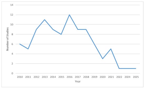 We tallied the distribution of 95 publications across various years, ranging from 2010 to March 2025. The data reveals fluctuations in publication output over time, with a noticeable peak in 2016 and a general decline in more recent years, as shown in Figure 3.