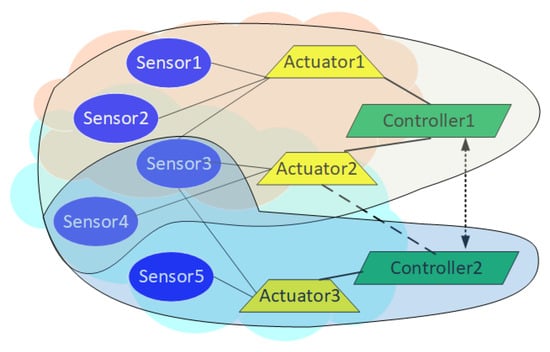 This system shows many dependency aspects of the problem. Sensors 2, 3 operate in the shared region and are thus affected by the environmental changes in either area. Of these, sensor 3 is directly used by (and hence affected by) Actuator 2, but Sensor 2 will also be affected indirectly. Depending on the rules, a change in sensor 3 may activate Actuators 1 and 2 either redundantly or oppositely. Actuator 2 is located in the overlapping region, and thus its action can have an indirect impact on the operation of controller 2 even though it is controlled by controller 1.