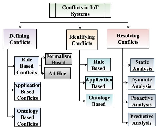 In a rule-based system, the IoT services are expressed as operational rules defined in the form trigger→action. An ontology can be defined as a specification of the conceptualization of a domain. Ontology-based frameworks enable the representation of knowledge through the use of well-defined semantic and syntactic rules. Ontologies are collections of domain knowledge encoded using axioms, natural language labels, synonyms, and definitions. They facilitate the creation of reusable entities and relations among devices, events, and activities in an IoT system. In an ontology-based approach, a conflict is defined as an interference with the user’s preferences or when postconditions for initiating an event conflict with preconditions of a happening event. Application-based work is concerned with resolving inter-application conflicts; the presence of multiple apps controlling the same actuator or device results in potentially undesirable interactions. For instance, in a smart home, the owner has two apps: one that sounds an alarm when smoke is detected, and another that unlocks the doors. Additionally, the same owner installed an app that automatically locks the door when the homeowner leaves the house. Even after these apps were safely installed, they interact unexpectedly, resulting in inter-app conflicts.