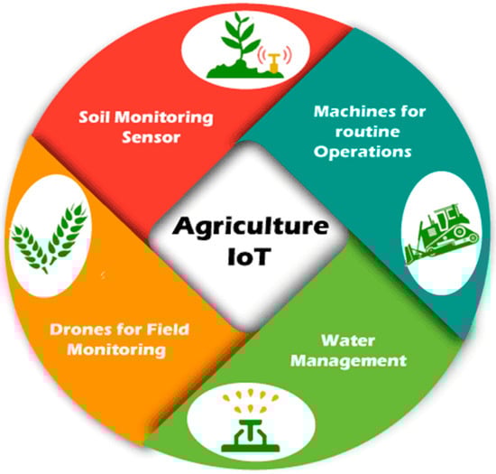 The uses of IoT to tackle challenging gardening tasks sparked a new phase of fact-based ambitious decision-making and also accuracy farming [,]. By giving farmers useful information about the fitness of their dirt and its nutrients levels, soil monitoring devices help them apply fertilizer and manage their crops more effectively. Routine agricultural operations are automated by machines with IoT capabilities, which lowers labor costs and improves operational efficiency.