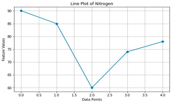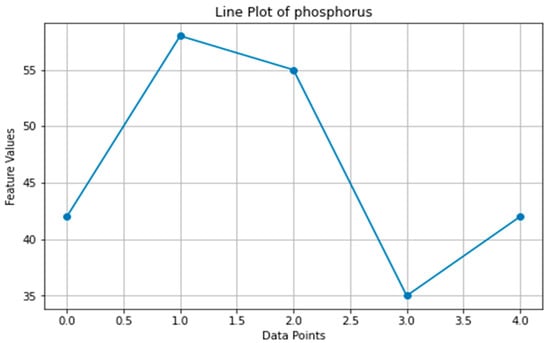 Figure 5 provides a line plot showing the phosphorus levels. The changes in soil nutrient levels (Nitrogen, Phosphorus, and Potassium) are the result of fertilization practices. Fertilizers were applied at specific intervals to ensure adequate nutrient availability for the crops. The spikes in nutrient levels in the graph indicate the times when fertilizers were added to the soil. Over time, the levels decrease as the nutrients are absorbed by plants and leached out of the soil as required for crop development. Starting from 0.0, the ratio shows that 43 units are needed. When the data point approaches 1.0, the level drops precipitously to 90 units. After 3.0 data points, it starts to decrease even more, reaching a value of 35 units. Figure 5 peaks early and then declines, suggesting a successful short-term intervention like nutrient-rich fertilizer that loses effectiveness over time.