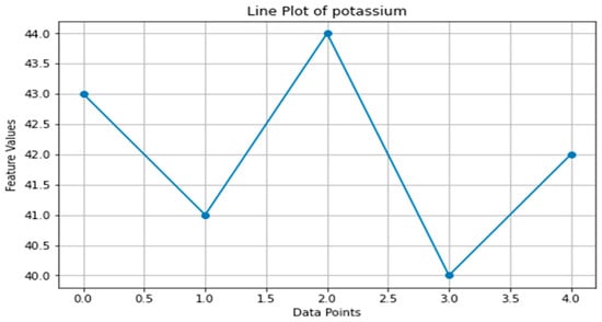 The line plot shows in Figure 6 the potash K levels required for crop development. Starting from 0.0, the ratio shows that 43 units are needed. When the data point approaches 1.0, the level drops precipitously to 41 units. Then, after 3.0 data points, it starts to decrease even further, reaching a value of 40 units. For environmental monitoring, the fluctuations in sensor readings for Figure 6 are attributed to changes in environmental conditions such as temperature, humidity, and sunlight. These factors can influence the sensor readings independently of any direct agricultural practices. The data helps in understanding the environmental impact on soil conditions and sensor performance. Figure 6 shows a balanced rise and fall, which may reflect a controlled experiment where a growth stimulant was applied and later removed.