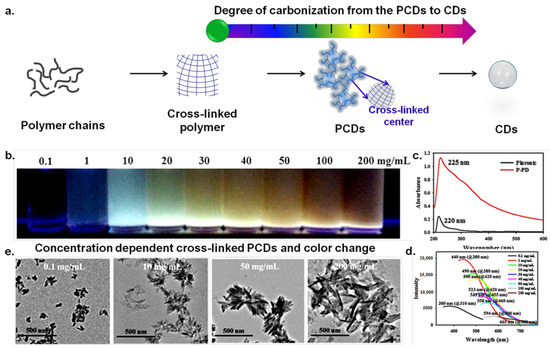 (a) The schematic diagram illustrates the cross-linking and degree of carbonization of the carbon polymer dots (CPDs) and carbon dots (CDs). (b) The photoluminescence (PL) behaviors of polymer carbon dots (PCDs)-based on cross-linking and concentration. (c) The absorption spectrum of precursor PCDs and after synthesis of PCDs (P-PD). (d) The concentration dependent fluorescence emission spectrum of PCDs. (e) The TEM images of CPDs indicates the polymeric properties and cross-linked nature. Reprinted with permission from ref. [5] Copyright© 2015 John Wiley & Sons, Ltd.