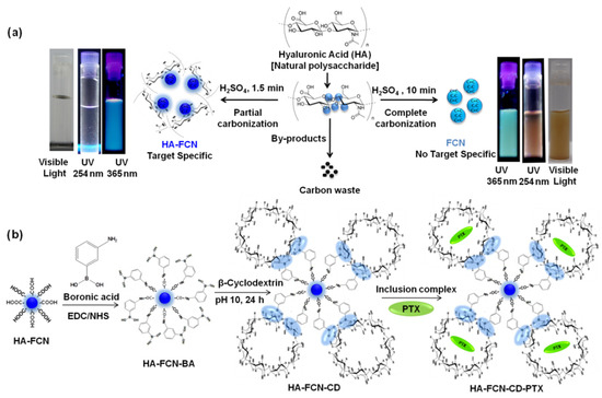 In one notable study, the controlled carbonization method using hyaluronic acid (HA) results from partial-carbonized HA-FCN with remaining HA (Figure 2). Hyaluronic acid (HA) is commonly used in tumor-targeted drug delivery owing to CD-44 receptor binding affinity. The noticeable exploration showed in vivo for targeted delivery and bio-imaging potentials. Moreover, fully carbonized the fluorescent carbon nanoparticle (FCN) from the same sources resulted in a biocompatible bioimaging probe [46]. Further extension of this notable study found HA-FCN conjugated with boronic acid to form diol-linkage with cyclodextrin. Finally, the chemotherapeutic paclitaxel was part of the inclusion complex into HA-FCN conjugated cyclodextrin. Their novel attempts have allowed for controlling drug release in response to extracellular tumor environment (pH) and external-remote photo thermally [47]. These facts have fueled efforts to develop a robust drug delivery system that can bring new hope for cancer treatment.