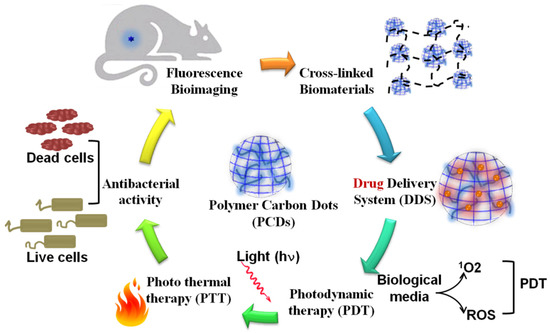 At the same time, photothermal-dependent light-responsive CPDs could be employed in temperature-controlled drug delivery and photothermal chemotherapy [61,62]. In this arena, the inorganic metal oxide nanoparticles and fully carbonized graphene oxide, CDs, and carbon nanotubes are well-recognized materials; however, CPDs did get much recognition in the research community [63,64,65,66,67,68]. For instance, the polymeric nature of CPDs can load maximum drug on its lengthy chain to perform a light-triggered controlled drug release upon irradiation.