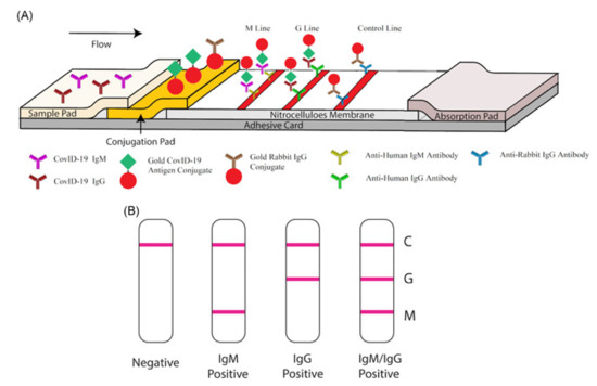 Figure 2. Schematic illustration of rapid SARS-CoV-2 IgM-IgG combined antibody test. (A), Sche-matic diagram of the detection device; (B), an illustration of different testing results, where C means control line; G means IgG line; M means IgM line. IgG means immunoglobulin G; IgM means im-munoglobulin M; SARS-CoV-2 means severe acute respiratory syndrome coronavirus 2. Adapted with permission from Ref. [90]. Copyright 2020, Wiley Periodicals, Inc.