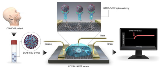 Recently, carbon-based nanomaterials, for example, graphene, carbon nanotubes (CNTs), and carbon dots (CDs), have also gained attention in the development of diagnostics for COVID-19. These nanomaterials have photoluminescence, biocompatibility, and high stability, which distinguish them for applications, including biosensing and bio-imaging [93]. The use of graphene nanoparticles for diagnostics of respiratory viruses, including SARS-CoV-2, has been reported [94]. Recently Seo and co-workers have reported the use of a field-effect transistor (FET)-based biosensor platform for rapid SARS-CoV-2 detection (Figure 3) [95]. This FET-based biosensor provides high sensitivity and rapid diagnosis with the help of a small sample quantity. The sensing area of the FET biosensor was made with a 2D sheet of graphene NPs due to their excellent properties such as high carrier mobility, high electronic conductivity and a large surface area. Here, they have functionalized the graphene-based biosensor with SARS-CoV-2 spike antibody through a probe linker, 1-pyrenebutyric acid N-hydroxysuccinimide ester (PBASE). Clinical COVID-19 patient samples were evaluated using nasopharyngeal swab specimens, cultured virus samples and antigen proteins, and a positive response was observed within a few minutes with a limit of detection of 1 fg/mL. Also, this FET-based biosensor was able to distinguish the SARS-CoV-2 antigen proteins from those of MERS-CoV [95].