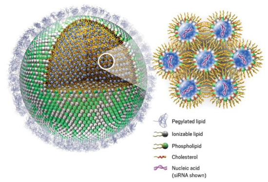 Scheme 2. A schematic of lipid nanoparticle (LNP) contains hundreds of small interfering RNA (siRNA) molecules, each surrounded by ionizable lipids, phospholipids, and cholesterol.
