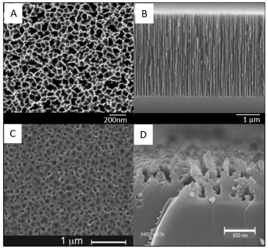 The NIMS surface morphology is shown by scanning electron microscopy in the top and cross-sectional views (A,B). The pore size of NIMS was estimated between 80 and 100 nm in diameter, and the pore depth of NIMS was 3.5 µm (B). The average pore size of DIOS was 120 nm, and the average pore depth was 450 nm. The image of the DIOS surface (C,D) was reprinted with permission from Ref. [23]. Copyright (2015), Elsevier.