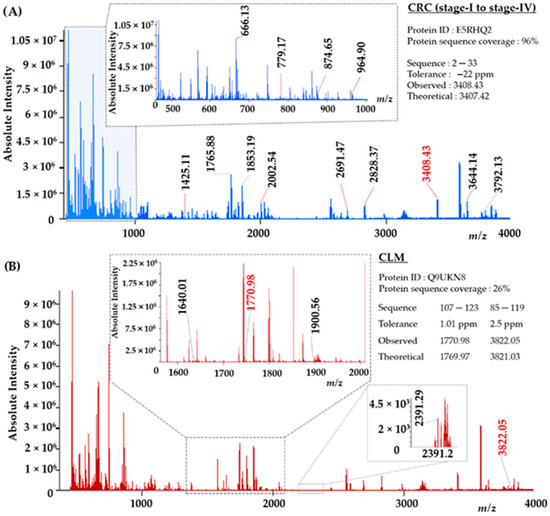 NIMS-FT-ICR-MS identified the top discriminative ions that can differentiate CRC disease from the CFI group. We interpreted the m/z spectral value of peptide ions (labelled in red) that showed a high score of sequence coverage, which matches protein hits (MASCOT). (A) We identified m/z 3408.43 (±2 ppm) matching PP2A was upregulated in CRC all stages (stage-I to IV) group compared to CFI. (B) Ions m/z 1770.98 (±1.01 ppm) and m/z 3822.05 (±2.05 ppm) matching ATF3 protein was upregulated in the CLM group compared to CFI.