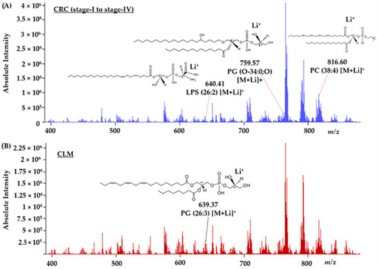 Further, we performed a structural determination of some low abundant lithiated glycerophospholipids such as lysophosphatidylserine (LPS)-LPS (26:2) [M + Li]+ observed at m/z 640.41, phosphatidylglycerol (PG)-PG (O-34:0; O) [M + Li]+ at m/z 759.57 and PC (38:4) [M + Li]+ at m/z 816.60 in CRC compared to CFI. Figure 4A shows lithiated lipid peaks identified in CRC group. Further, direct analysis on DIOS can be used for structural characterisation of lipids through laser-induced dissociation (LID-MS/MS), where lithiated-PG (26:3) [M + Li]+ has an sn1–acyl group with 18 carbon fatty acids containing 3 double bonds and an sn-2–acyl group with 8 carbon fatty acids anionic glycerol head group observed at m/z 639.37 [M + Li]+ with mass tolerance 0.0074 Da. Figure 4B shows lithiated lipid peaks identified in the CLM group.