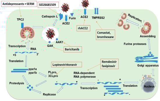 The table below illustrates some important drug-targeted sites in the SARS-CoV-2 life cycle, including the cellular entry mechanism, involving angiotensin-converting enzymes (ACE2), transmembrane serine protease 2 (TMPRSS2), RNA transcription, replication mediated by helicase and RNA-dependent RNA-polymerase (RdRp). The table further describes the translation and proteolytic processes of viral proteins mediated by chymotrypsin-like and papain-like proteases in addition to virion assembling and exocytosis []. These forgettable proteins are essential for curing COVID-19 with existing drugs that have therapeutic potency against these specific proteins and enzymes []. Drugs capped with silver Nanoparticles (AgNPs) were found to have the potential to block the cellular entry of SARS-CoV-2 through ACE2 attachment []. The development of recombinant human-ACE2 (rhACE2) for the treatment of acute lung injury has now shown to be a powerful viral entry inhibitor []. The life cycle and druggable targets of SARS-CoV-2 are schematically presented in Figure 1, while the mechanisms of targeting are summarized in Table 1.