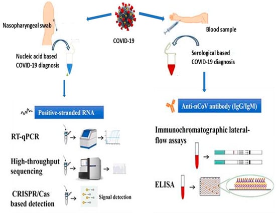 Detection of viral antigens is another method of diagnosing viral infections, including COVID-19. Although, the method is difficult to achieve due to the possible viral load fluctuation in the patient and high antibody responses []. Bin Ju et al. examined 15 and 206 samples collected from COVID-19 patients, respectively, and found a high amount of specific antibodies against SARS-CoV-2 RBD []. According to Zhao et al., an indirect ELISA kit based on recombinant nucleoproteins was tested and found to be 99% sensitive to SARS-CoV-2 antibodies (IgM and IgG). Currently, the FDA has approved more than 20 kits for use in an emergency to detect COVID-19 virus proteins []. The rapid antigen detection kit has been validated by the WHO and approved by the FDA for use in the diagnosis of COVID-19 because of its ease of handling, cheapness and speedy detection capability of less than 1 h. It was demonstrated to have given a limited sensitivity and high false negative result. Therefore, the rapid antigen detection assay for COVID-19-positive samples requires further validation with PCR testing before isolation and treatment []. The schematic presentation of the molecular diagnosis of COVID-19 is highlighted in Figure 2.