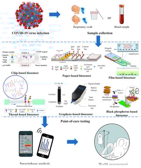Zhang, L.L. et al. have developed SPGE “screen-printed graphene electrodes” useful for point-care diagnostics due to their high sensitivity and excellent electrochemical properties. The GSPE biosensor was developed by incorporating or substituting the graphene nanoparticle into the conventional SPCE “screen-printed carbon electrodes” [,]. The samples are collected either from the blood or nasopharyngeal swab, and the method of detection involved the quantification of colorimetric loop-mediated isothermal amplification (LAMP) resulting from the changes in cathodic current following the interaction between SPGE and amplicons []. Point-of-care biosensors, such as chip-based biosensors [], paper-based biosensors [], film-based biosensors [], thread-based biosensors, [] graphene-based biosensors [], and black phosphorus-based biosensors [], have played a significant role in detecting and alleviating the spread of SARS-CoV-2 pandemic infection. Smartphone analysis could now be used for rapid point-of-care testing of pathogenic diseases, including COVID-19. As such, this would promote a global system of healthcare management []. These applications are presented schematically in Figure 3.