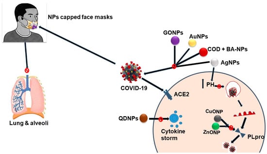 Gold nanoparticles (Au-NP) have a wide range of biomedical applications; they interact with various forms of viruses because of their unique electric, photolytic and catalytic properties. Consequently, Au-NP has been employed for viral detection assays. Recently, V.X. Ting and his team developed an AuNP-based biosensor that detects the presence of COVID-19 in the sample within 5 min [,]. Layqah et al. proved that Au-NP-based biosensors possessed high precision in detecting COVID-19 in a few minutes []. It was evident that graphene oxide nanoparticles (GONPs) and silver-graphene nanoparticles (Ag-GNPs) have a high affinity for inhibiting the interaction between the S-protein and host cells [,]. Additionally, zinc nanoparticles (Zn-NPs) claimed to have interfered with the viral replication process while inducing interferon production. Therefore, Zn-NPs could be beneficial in the combat against COVID-19 [,].