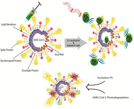 The mechanism of PS-virus inhibition involves the electrostatic interaction between the positive charge of PS and the negative charge of virus envelopes or nucleic acid. Therefore, enveloped viruses such as SARS-CoV-2 are significantly more likely to be cured by PDT than undeveloped viruses. The major target for PDT in SARS-CoV-2 structure is the spike protein (S1 and S2), as well as the nucleic acid. The PDT of SARS-CoV-2 via type-I process comprises the generation of free radicals by PS that interact with either nucleic acid or outer proteins of SARS-CoV-2, resulting in photo-oxidation of proteins, whereas the type-II process involves the interaction of singlet oxygen produced by PS and guanine residues of SARS-CoV-2, [] as demonstrated in Figure 5.