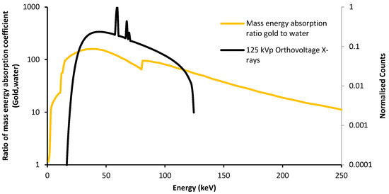 The ratio of mass energy absorption coefficient of gold compared to water against the orthovoltage filtration used (filter 4, 125 kVp) [27]. This was chosen as the optimal filter to increase the energy deposited by the interactions and hence increase dose enhancement.