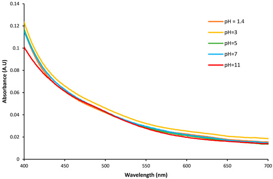 The phenomenon of plasmon resonance associated with the collective oscillation of electrons in the conduction band causes AuNPs to strongly absorb visible light. The general appearance of the spectra indicates that the suspensions are made up of nanoparticles of a few nanometers in diameter, and therefore the aggregation is low regardless of the pH value (as evidenced in Figure 2). The chemical surface functionalization of the nanoparticles may protect them nanoparticles from aggregation.