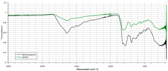 Fourier-transform infrared spectroscopy (FTIR) was taken to confirm the successful synthesis and cross-linking of the AF647 fluorophore. The spectra of the ligand coating were analyzed by a comparison between the molecular structures present in the samples with and without the cross-linked fluorophore. The data were taken using the Bruker VERTEX 80 infrared spectrometer (Bruker, Germany), within the range of 4000 cm−1 to 400 cm−1 at a resolution of 0.5 cm−1. In each case, the background spectrum was measured before the raw transmittance was recorded, and the solid samples were compressed onto the surface of the reflection unit (quartz). The background spectrum was removed from the raw data, and the new spectra were normalized using the S−S transmittance percentage (%) as a benchmark at 501 cm−1.
