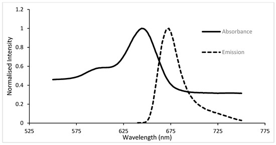 Using the SpectraMax Plus 384 Microplate Reader (Molecular Devices, USA), the absorption and emission spectra of the AuNP suspension were probed (Figure 6). The peak absorption was detected at 647 nm, and the peak emission at 673 nm (when excited with 647 nm, negligible scattering). This agrees well with the expected absorption and emission of AF647. The absorbance of the light, however, remains at least at a relative 0.3. This is likely due to the absorption by the AuNPs themselves, which will have a peak in optical density in the range of 550 to 600 nm depending on their size [38].