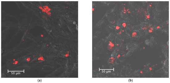 Confocal images of 9LGS cells at 63× magnification exposed to either (a) 50 or (b) 100 ug/mL of the gold suspension for 24 h. The red areas are the detection of the AF647 fluorophore attached to the nanoparticle against the bright field.