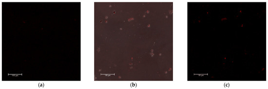 Detection of AF647 using a 633 nm excitation laser with confocal microscopy at 20× magnification for (a) control 9LGS cell population and cells exposed to 50ug/mL gold suspension for 24 h; (b). with bright field; (c) without bright field. Cells were washed and suspended in PBS (hence they are not adherent). The red areas of AF647 fluorescence are clearly located inside the cells.