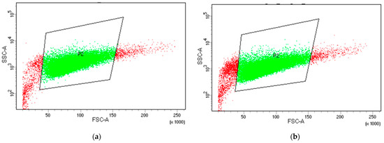 Forward scatter vs. side scatter for (a) control cell population and (b) cells exposed to 50 µg/mL AuNP suspension for 24 h. Forward vs. side scatter is commonly used to identify the size of cells and particulates. If nanoparticles were large or aggregated and internalized, the side scatters would increase dramatically.