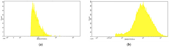 Furthermore, the AF647 fluorophore attached to the AuNPs was detectable in cells using a 640 nm laser (Figure 10). The control cells showed almost no fluorescence, but there was significant fluorescence in the cells exposed to the gold suspension. The mean value for control cells was 928, whilst the mean value for cells exposed to the AuNP solution was 16,377 (arbitrary intensity units).