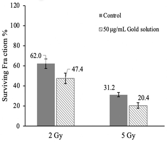 Clonogenic assay was also used to determine the enhancement of 125 kVp radiation, shown in Figure 11. Error bars represent the standard deviation taken over three repeats, with two triplicates per repeat, and nanoparticle-treated samples were normalized to the un-irradiated nanoparticle control. A pooled t-test was performed on the data showing that the surviving fraction for control and AuNP treated cells are significantly different for both 2 and 5 Gy irradiation (2 Gy p value = 8.83 × 10−5 and 5 Gy p value = 3.38 × 10−8. As is clear, the AuNPs lead to a reduced surviving fraction when compared to the control cells. The radiation enhancement ratio (RER) was [39] calculated for each dose.