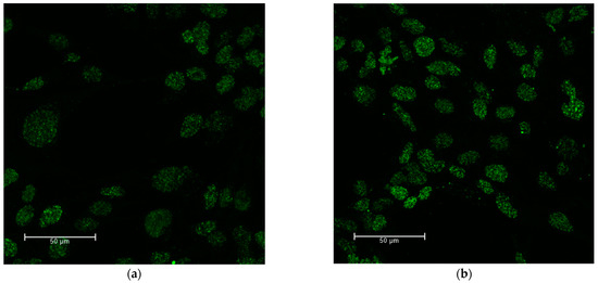 -H2AX characterization with green representing double-strand break foci. Images are a stack of 50 individual slices at 63× magnification taken from the first instance of foci to the last instance, across the depth of the cells (a) 9LGS control and (b) with 50 µg/mL of AuNP solution, both irradiated at 5 Gy with 125 kVp.