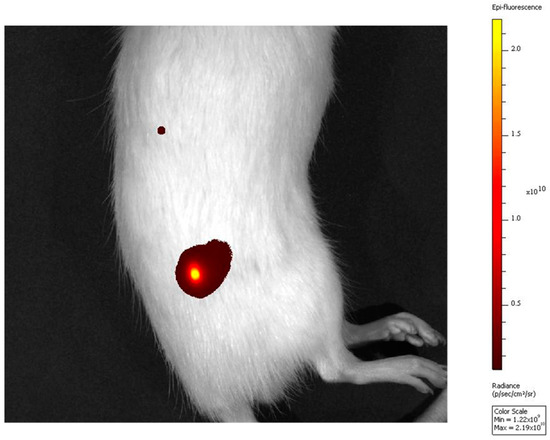 A 50 µg/mL concentration of the AuNP suspension that was diluted in DPBS was injected into the flank of a Fischer 344 rat cadaver at an approximate depth of 5 mm. Using optical imaging targeting the AF647 excitation with the IVIS Spectrum CT unit, the fluorescence is obvious around the injected site (Figure 13).