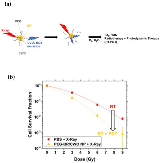 Radioluminescence, which is normally produced by the interaction of ionizing radiation with a scintillator material, can be used as a light source in PDT. The use of X-ray sources in combination with scintillating nanoparticles can overcome the barrier of light tissue penetration [62]. NaGdF4:Eu3+ NPs were used to convert X-rays into optical photons within the 600–700 nm range to perform X-ray luminescence optical tomography [62]. Bilirubin-photodynamic nanoparticles (PEGylated bilirubin-encapsulated CaWO4 nanoparticles or “PEG-BR/CWO NPs”) can mediate combined radiotherapy/PDT in solid tumors due to the radioluminescence properties of their CaWO4 nanoparticle cores. PEG-BR/CWO NPs emit UV-A and visible light from their CaWO4 cores, which excites bilirubin and leads to the production of singlet oxygen (Figure 2). The clonogenic survival array demonstrates the phototherapy enhancement due to PEG-BR/CWO NPs.