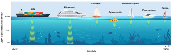 Schematic representation of various optical imaging modalities discussed in this review. Different modalities are represented as different boats, each with its individual pros and cons and its specific utility. The x-axis represents sensitivity (lower to high, left to right). The y-axis represents the depth of penetration/field of view, as indicated below each boat. Reprinted with permission from Ref. [68]. Copyright 2020, Society of Nuclear Medicine and Molecular Imaging.
