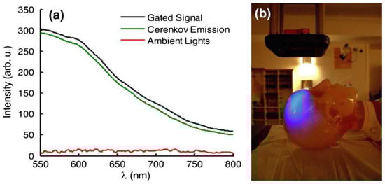 (a) The gated detection of Cerenkov emission with room lights on is shown with spectra acquired from a scattering phantom. Cerenkov emission is obtained by calculating the difference between the gated signal and ambient lighting signal. (b) A photograph of the room with a corresponding image of Cerenkov emission from a human head phantom for radiation therapy overlaid to illustrate the amount of ambient lighting present for all experiments. Reprinted with permission from Ref. [78]. Copyright 2012, Optica Publishing Group.