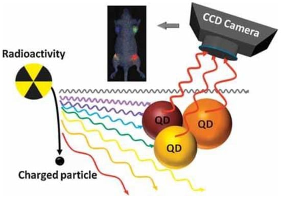 Cerenkov luminescence imaging (CLI) can be an emerging hybrid method that uses light emission from many commonly used medical radioisotopes [63,79]. The term CLI was coined by Robertson et al. in 2009 when they studied Cerenkov emission from the PET probe 18F-FDG in well plates and a xenograft tumor in a mouse [80]. Boschi and Spinelli summarized several studies referring to CLI in the biomedical field. They organized them in a table to help interested viewers for a fast consultation, subdividing CLI into different areas of applications (cancer imaging, tomography, Cerenkov-induced fluorescence, intraoperative modality, medical applications in humans, models and others) [81]. Liu et al. used CL produced by β-tracer iodine-131 as an internal light source to illuminate three different CdSe–ZnS core–shell Quantum Dots (QDs) (QD655, QD705 and QD800) both in vitro and in vivo (Figure 5). The excited QDs allowed for multiplexing optical imaging, producing fluorescence in much higher optical intensities [82], whereas the number of luminescent photons produced from radionuclide radiation is small.