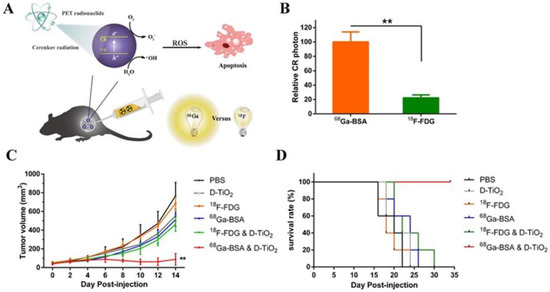 (A) Schematic of the CR-mediated excitation of TiO2 NPs to generate ROS that induced cell apoptosis of cancer cells. (B) Relative amounts of CR photons generated by intracellular 68Ga-BSA and 18F-FDG. (C) Tumor growth curves of different groups of mice after treatments indicated. (D) Survival curve indicates that co-injection of Ga-BSA and D-TiO2 NPs was the optimal choice among methods. ** p < 0.01. Reprinted with permission from Ref. [96]. Copyright 2018, American Chemical Society.
