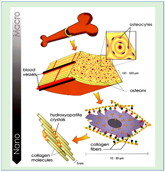 Ordered classification of bone tissue over their magnitude and occurrence ranging from calcified outer compact layer to resident cells coated with cell membrane receptors and precise nanoarchitecture of the surrounding extracellular matrix. Reproduced with permission from Reference [22] © 2005 American Society for the Advancement of Science.