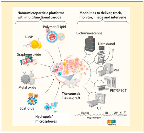 Over the last decade, advances in nanotechnology have enabled accessibility to structural mimics that facilitate the engineering of various tissues. Subsequently, and more recently, there has been an unmet need to develop personalized medicine for custom-made therapies toward individual patients’ prerequisites [27]. These nano-theragnostic strategies for tissue engineering and regenerative medicine can thus be used to direct tailor-made requirements through the articulate design to endorse tissue-specific functions in the body [28]. Such strategies can initiate in situ tissue formation by utilizing the body’s natural cellular populations to drive this renewal without ex vivo cell manipulation [29]. Furthermore, effective diagnosis and prognosis of bone-related disorders are essential to restrict morbidity and mortality in a population. Engineering tissues can be challenging, as well as the difficulty in precisely examining the prognosis, personalized medicine technologies, and monitoring treatment efficacy and disease conditions [30]. Integrating diagnostic modalities with a therapeutic biomaterial platform permits non-invasive surveillance of the engineered tissue of interest while providing therapeutic signals to aid regeneration and repair [30,31].