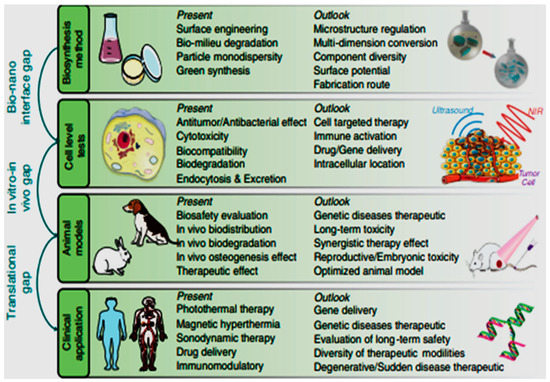 Engineered nanoplatforms with diagnostic and reformatory abilities are cutting-edge technological miracles that not only facilitate the reparation of tissues of interest but also decide the suitability of the biomaterial and their cargo. However, challenges in successfully engineering tissue persist. Over the years, there has been a transition in the process of development of innovative theragnostics, such as nanoparticles, scaffolds, cell-based matrices, etc. The current investigations are largely directed toward the preparation and analytical characterization of these nanoplatforms, with very little light being shed on their ability to fit in with genetic diversity, long-term toxicity, and in vivo functionality. Hence, advancements that ensure that these systems are translatable from the laboratory to the clinic need special attention (Figure 3).