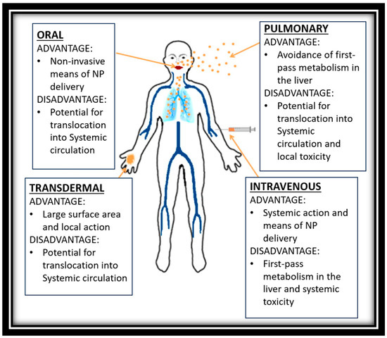Phospholipids/surfactants are the primary constituents of self-assembled vesicular nanoparticles (NPs), which show promising potential for nanomedicine as novel biomedical nanocarriers. The two most common vesicle subcategories in recent decades, liposomes and noisome, have been utilized extensively in the treatment of cancer [34,35]. NPs can be administered into the body by several pathways having its own benefits, Figure 1 demonstrates some of them below.