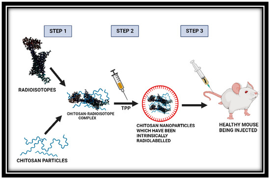 In modern medicine, accelerator-produced radioisotopes are frequently used for imaging, cancer therapy, and therapy and diagnostic combination (theranostics) [115]. Several radioisotope-based treatments are in advanced stages of clinical trials, which may pave the way for a strong demand for specific accelerator systems devoted to radioisotope production [116]. Although cyclotrons are the industry standard, we explore different options here using linear accelerators. Linacs have the advantage of modularity, compactness, and lower beam loss with less shielding needed when compared to cyclotrons [117]. Considerable attention has been given to the development of nanocarrier systems for drug delivery that utilize chitosan, which is a linear chain polysaccharide derived from the chitin of arthropods and occurs naturally. This non-toxic, biodegradable, and biocompatible polymer was combined with specific radioisotopes for diagnostic and therapeutic purposes (64Cu, 68Ga, 90Y, 153Sm, 166Ho and 177Lu) [118]. By using the ionotropic gelation method, radiolabeled chitosan was transformed into nanoparticles. In epithelial lung cancer cells, the surrogate nanoparticles’ cell uptake and cytotoxicity were assessed. The intrinsically radiolabeled nanoparticles had high in vivo stability, according to biodistribution studies carried out on healthy C57BL/6 mice; this is shown in Figure 3 below [119].
