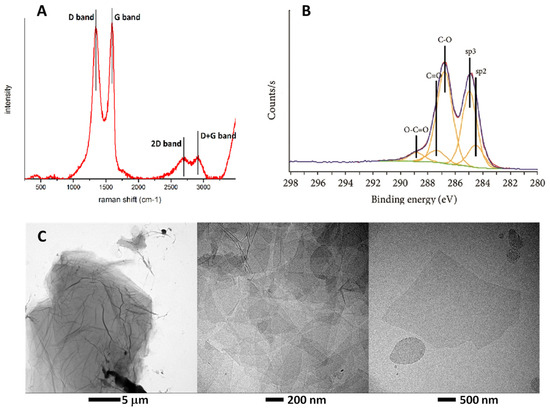 (A) Raman spectra of GO. (B) XPS spectra of GO in the C1s range (purple line) and a multipeak analysis for the carbon 1s (orange line). Green line was used to fit baseline. (C) TEM image of the GO showing aggregates (left), stacked flakes (centre) and single flakes (right).