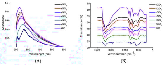 (A) UV spectra of reduced GO and rGO samples, obtained at a concentration of 0.05 mg/mL and pH 10. (B) Solid state FT-IR spectra of GO and rGO samples.