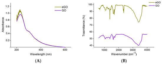 (A) Comparison of UV-Vis spectra of GO and eGO taken, respectively, at the concentrations 0.025 mg/m. (B) comparison of solid-state FT-IR spectra of GO and eGO.