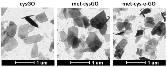 In Figure 4, we report TEM analyses of cysGO, met-cysGO and met-cys-e-GO. As evident from the images, all of the samples are well dispersed, and in comparison to pristine GO (Figure 1), they exhibit a more pronounced contrast. This may be related to their high degree of surface functionalization.