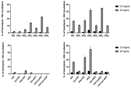 Hemolytic activity for GO and its selected reduced and functionalized derivatives at the concentrations of 2.5 μg/mL and 25 μg/mL, after 18 (left panels) and 24 h (right panels)-incubation with RBCs. Each data point is presented as mean ± absolute error (n = 2). Data are expressed as % of total hemolysis induced by pure distilled water (100% release).
