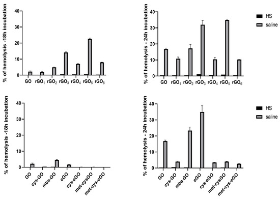 Hemolytic activity in HS and saline solution for GO and its selected reduced and functionalized derivatives at the concentration of 2.5 μg/mL, after 18 (left panels) and 24 h of incubation with RBCs (right panels). Each data point is presented as mean ± absolute error (n = 2).