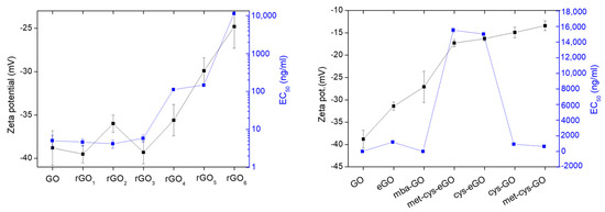 Comparison between ζ-potential measures (black squares) and EC50 (blue squares) for GO and its functionalized derivatives. ζ-potential data are presented as mean ± standard deviation (n = 3).