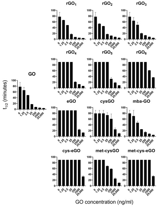 The coagulation half-time (t1/2) was then extrapolated from the curves (Figure 8). From the graphs presented in the figure, it is evident that the t1/2 remains similar to the physiological t1/2 at a higher concentration for rGO4 and rGO5 (25 ng/mL) with respect to GO, while for rGO6 it remains unchanged even at a concentration ten times higher (250 ng/mL). Esterified GO does not induce changes in the plasma coagulation kinetics up to the concentration of 250 ng/mL; functionalization with cysteamine of eGO further enhances its biocompatibility (t1/2 = 2500 ng/mL), while methylation of cys-eGO does not induce significant changes. Cysteamine functionalization of GO improves its biocompatibility: its t1/2 remains unchanged compared to the control, even in the presence of 25 ng/mL of cysGO. Also, in this case, methylation does not lead to a significant increase in the biocompatibility of met-cysGO.